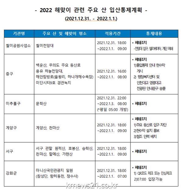 그 밖에 인천의 주요 산인 문학산·백운산·천마산·월미산, 무의도 주요 등산로, 용유 하늘전망대, 월미전망대 12월 31일 18시부터 1일 오전 7시까지 폐쇄한다.