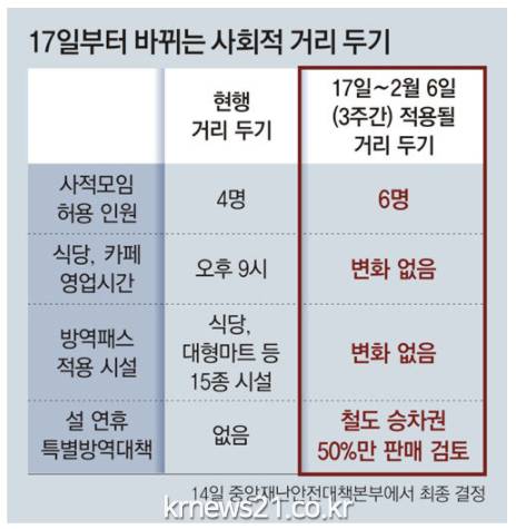 설 연휴를 앞두고 정부가 현행 거리두기를 3주간 연장할 방침이다. 다만 사적모임 인원 6명으로 소폭 완화될 것으로 보인다.