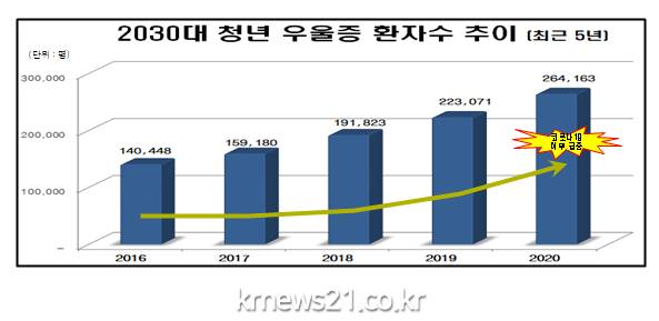 실제로 2020년 인천시 청년고용률은 46.8%로 2019년(48.8%) 대비 2% 하락했으며 청년취업자 수도 2019년 25만 명에서 2020년 23만 명으로 줄었다. 우울증을 앓고 있는 2030 청년의 수도 최근 5년간 꾸준히 증가하고 있다.