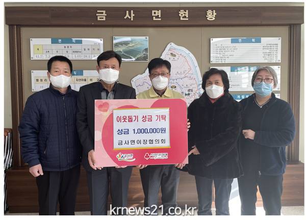 금사면정과 주민을 원활하게 연결하여 주민화합으로 지역발전에 헌신·봉사하는 금사면이장협의회는 지역사회 나눔까지 실천해 귀감이 되고 있다.