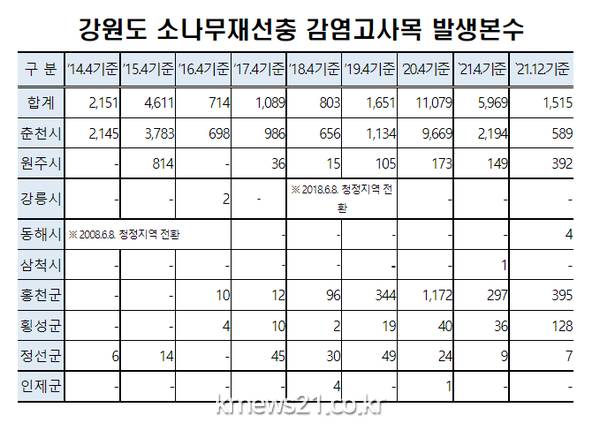 ▲ 사진=강원도청강원도에 의하면 동해시 용정동 산120-3번지외 1필지에서 발견된 소나무 고사목 4본이 강원도 산림과학연구원 및 국립산림과학원에서 소나무재선충병 감염여부를 검사한 결과 소나무재선충병에 감염되었음을 12월 29일에 최종 확인되었다.