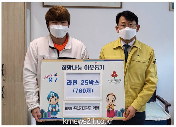 ▲ 사진=대전광역시대전 중구(구청장 박용갑)는 11일 대흥동 소재 꾸러기태권도 학원(관장 장래전)에서 라면 760개를 기탁했다고 밝혔다.