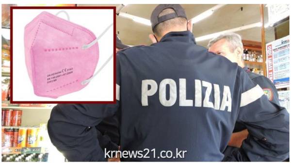 ▲ [SHUUD.mn=뉴스21 통신. 무단 전재-재배포 금지.]이탈리아 경찰이 연분홍색 때문에 코로나19 예방을 위해 FFP2 마스크 착용을 거부했다.