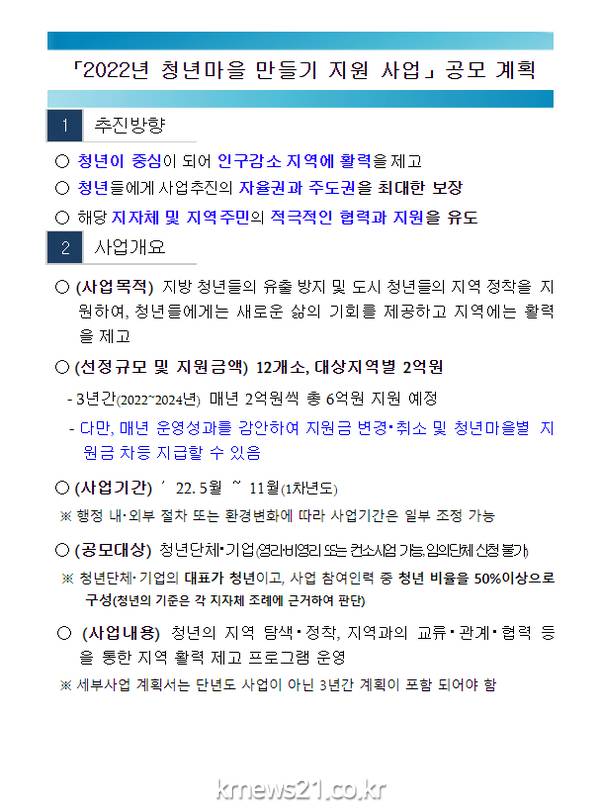 ▲ 사진=강원도청강원도는 행정안전부 공모사업인 2022년 「청년마을 만들기 사업」에 참여할 도내 청년단체(기업)를 모집한다.