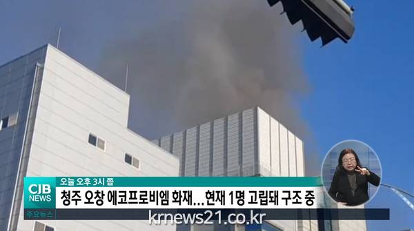 ▲ 사진=CJB NEWS 캡처국내 최대 2차전지 양극재 생산업체인 에코프로비엠의 청주공장에서 21일 대형 화재가 발생했다. 화재가 발생한 건물에는 직원 1명이 고립됐다가 숨진 채 발견됐다.