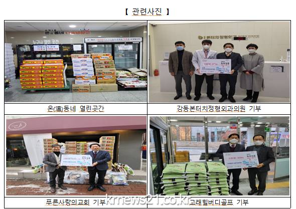 고덕래미안힐스테이트 입주민 동호회 고래힐버디골프(회장 정주모)에서 쌀(10kg) 30포를, 강동본터치정형외과의원(대표 양철중)에서는 쌀(10kg) 20포를 기부하였고, 명성교회에서 생필품꾸러미 100박스, 푸른사랑의교회와 커피제이에서 현금 261만원과 쌀 15포, 라면 43박스를 후원하였다. 한사랑교회에서는 귤 30박스를 기부하는 등 다양한 식재료가 채워져 독거어르신 등 결식이 우려되는 취약계층에게 큰 힘이 되었다.