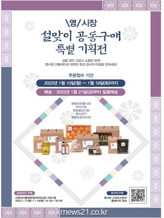공동구매 주문은 오는 1월 10일부터 18일까지, 홍보물의 QR코드를 스캔하거나 네이버 쇼핑 ‘영시장’(영등포구 전통시장 협업 공동브랜드)을 검색해 구매하면 된다.