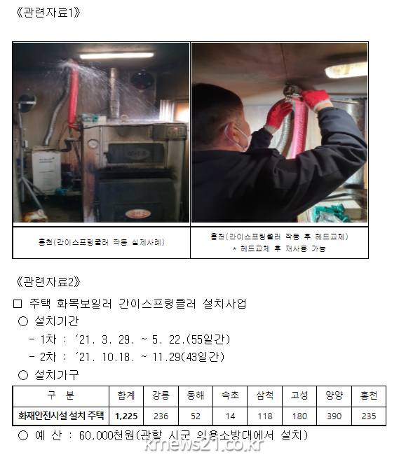 강원도소방본부는 2021년부터 화목보일러로 인한 주택화재와 산림화재 예방을 위하여 6천만원의 사업비를 들여 강릉, 동해, 속초, 삼척, 고성, 양양, 홍천 등 6개 시·군에 간이스프링쿨러 1,225개소를 시·군 의용소방대원을 동원하여 설치하였으며, 올해도 지속적으로 화목보일러 설치 가구에 대한 설치를 확대 할 예정이다.