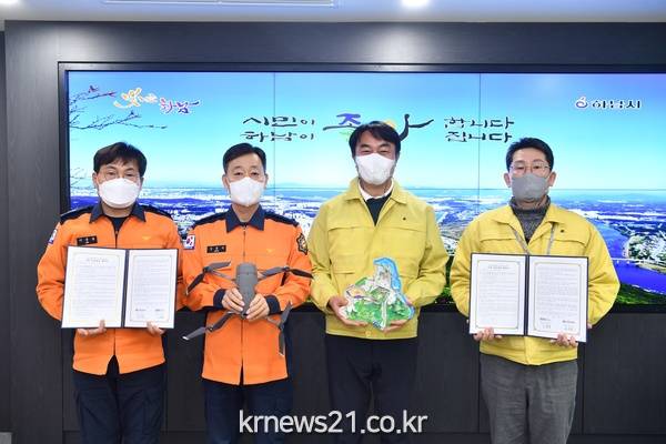 하남시(시장 김상호)는 지난 21일 시장실에서 하남소방서와 재난·재해 예방 및 대응을 위한 드론 무상대부 업무협약을 체결했다고 밝혔다.