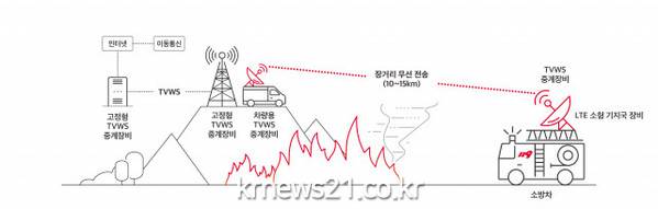 TV 유휴대역 주파수는 디지털 TV의 방송 대역 중 방송 채널 사이의 간섭을 막기 위해 지역적으로 사용하지 않는 주파수 대역으로, 전파 도달거리가 10~15km로 길고 투과율이 높아 대형 산불 발생 지역에서 활용하기 쉽다.