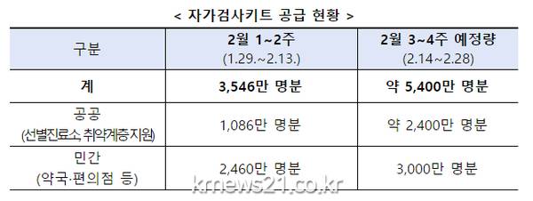 지난 2주간 선별진료소 등에 1,086만 명분, 약국·온라인쇼핑몰 등에 2,460만 명분 등 총 3,546만 명분의 자가검사키트가 공급됐다.