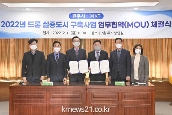 ▲ 사진=원주시원주시와 KT는 2월 11일(금) 오전 11시 원주시청 투자상담실에서 드론 실증도시 구축을 위한 업무협약(MOU)을 체결했다.