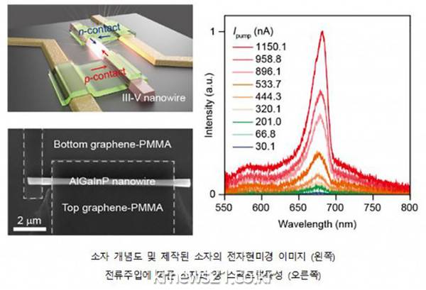 연구팀은 다중겹 그래핀을 수직 절단 방향으로 p-i-n 도핑된 반도체 나노선의 위쪽과 아래쪽 양단에 접촉시켜 p-contact와 n-contact를 구현했고, 전류 주입을 통해 밝기 제어할 수 있는 나노선 발광소자를 제작했다.