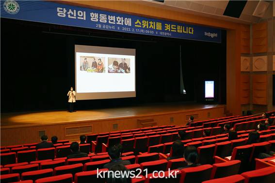 ▲ 사진=대전광역시대전시는 17일(목) 시청 대강당에서 코로나19 방역업무 등 피로감이 누적된 전직원을 대상으로 소통전문가 유수란 강사를 초빙하여“스트레스를 이겨내고 삶의 행복지수를 높이는 방법’에 대해 특강하는 등 올해 두 번째 공감누리(직장교육)를 개최했다.