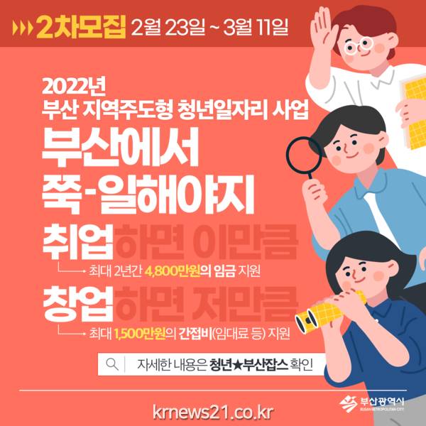 ▲ 사진=부산광역시부산시(시장 박형준)는 오는 23일부터 3월 11일까지 ‘부산 지역주도형 청년일자리 사업’에 참여할 청년을 추가 모집한다고 밝혔다.