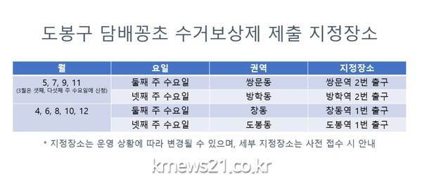 담배꽁초를 제출하는 장소는 쌍문역 2번 출구, 방학역 2번 출구, 창동역 1번 출구, 도봉역 1번 출구이다. 역별로 수거한 담배꽁초 제출일이 다르므로 반드시 사전 안내 시 확인하고 방문해야 한다.