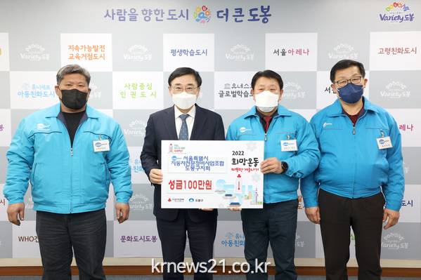 ▲ 사진=도봉구도봉구(구청장 이동진)가 2022년 2월 24일 구청 소통협력실에서 자동차전문정비조합 도봉구 지회(카포스 도봉지회, 지회장 김시경)로부터 따뜻한 겨울나기 성금 1백만 원을 전달받았다.
