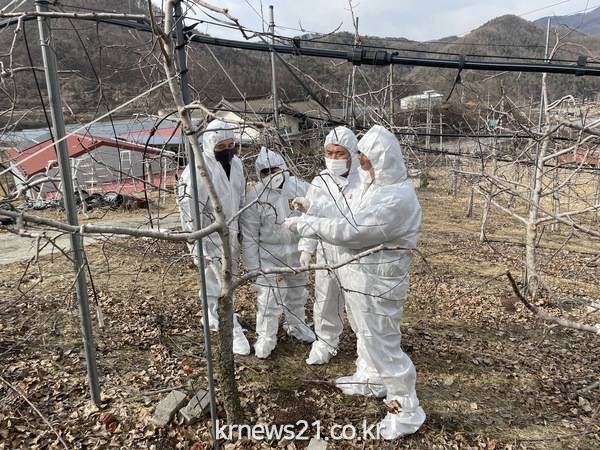 ▲ 사진=괴산군충북 괴산군 농업기술센터는 유기농업연구소와 연계해 2월 3일부터 28일까지 18일간 위험관리농가를 대상으로 과수화상병 합동예찰을 실시했다고 밝혔다.