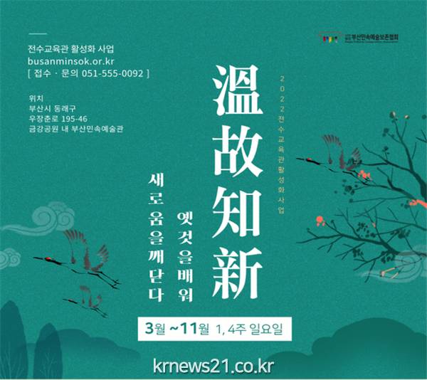 부산전통예술관에서는 4월 6일부터 11월 19일까지 무형문화재 기능종목 장인 7명이 우수한 우리 전통공예를 직접 전수하는 ‘무형문화재 전통문화 체험교실’을 운영한다.