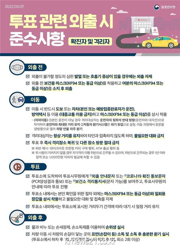 ▲ 사진=질병관리청제20대 대통령 선거 전날인 오늘(8일) 중앙방역대책본부는 코로나19 확진자와 격리자도 대통령 선거를 위한 외출을 한시적으로 허용한다고 밝혔다.