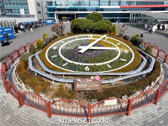 ▲ 사진=대전광역시대전시는 대전역 서광장에 설치된 꽃시계 주변에 봄을 알리는 팬지 꽃 2,500본을 식재하여 꽃시계를 새롭게 단장했다고 밝혔다.