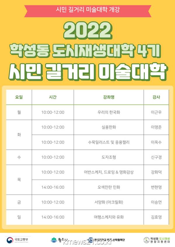 ▲ 사진=원주시원주시는 3월 11일 오전 10시 학성동 도시재생현장지원센터에서 수강생 및 시 관계자, 민족미술인협회 원주지부 등이 참석한 가운데 2022년 학성동 도시재생대학 4기 시민길거리 미술대학 개강식을 개최한다.