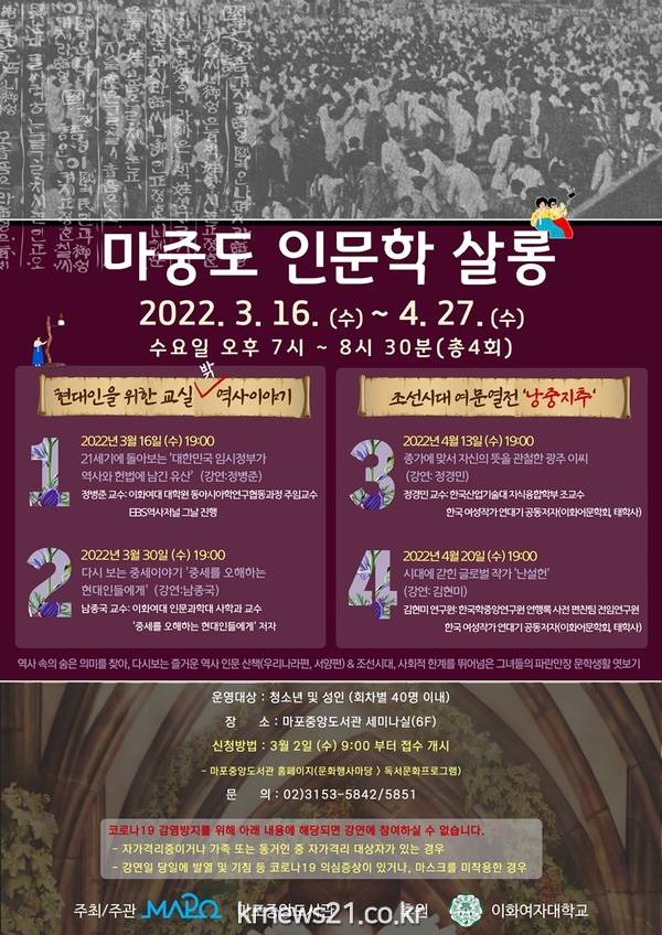 ▲ 사진=마포구 제공마포구(구청장 유동균)는 이화여자대학교와 협력하여 인문학 강연 ‘마중도 인문학 살롱’ 프로그램을 오는 16일부터 다음 달 27일까지 운영할 계획이라고 14일 밝혔다.