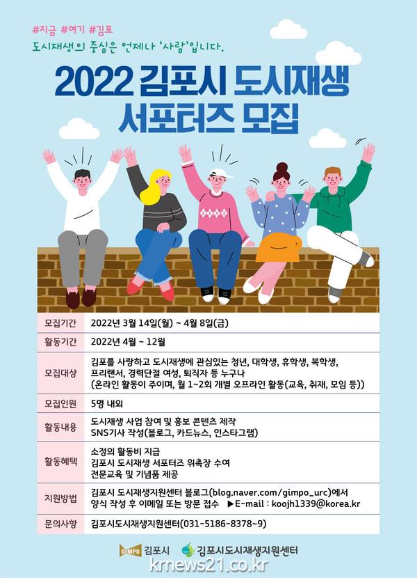 김포시 도시재생지원센터는 김포시민을 대상으로 다음 달 8일까지 도시재생 사업을 홍보하고 도시재생 콘텐츠를 제작하는 도시재생 서포터즈를 공개 모집한다.