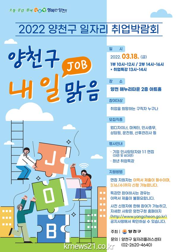 ▲ 사진=양천구양천구(구청장 김수영)가 오는 3월 18일 해누리타운 아트홀에서 일자리플러스센터 주관 대규모 취업박람회인 ‘양천구 내일(JOB) 맑음’을 개최한다.