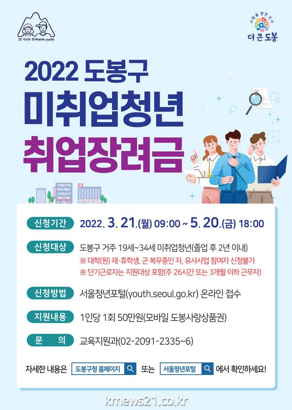 ▲ 사진=도봉구도봉구(구청장 이동진)가 코로나19 장기화로 어려움을 겪고 있는 도봉구 미취업 청년에게 취업장려금 50만 원을 지원한다.