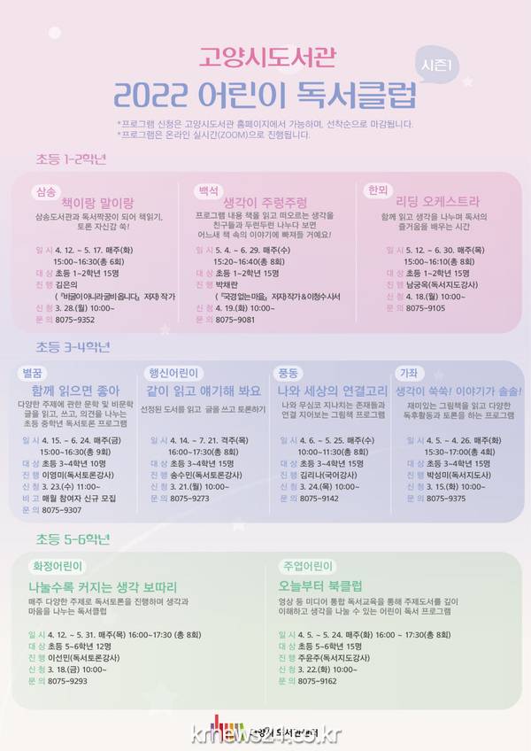 ▲ 사진=고양시고양시(시장 이재준) 시립 도서관이 오는 4월부터 ‘2022 어린이 독서클럽 시즌1’을 운영한다. 올해 어린이 독서클럽 시즌1은 고양시의 9개 시립도서관과 함께 학년별로 다양한 주제의 독서클럽을 진행한다.