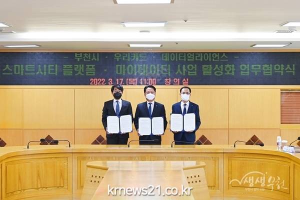 ▲ 사진=부천시부천시는 17일 우리카드(대표 김정기)와 스마트시티 챌린지 사업 컨소시엄 대표사 데이터얼라이언스(대표 이광범)와 함께 부천시가 추진하고 있는 다양한 스마트시티 사업 활성화를 도모하고 마이데이터 융합을 위한 전략적 업무협약(MOU)을 체결했다.
