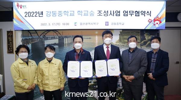 ▲ 사진=울산광역시 북구울산 북구는 17일 북구청장실에서 강동중학교와 학교숲 조성사업 협약을 체결하고, 학교 특성을 반영한 정원형 학교숲을 조성하기로 했다.