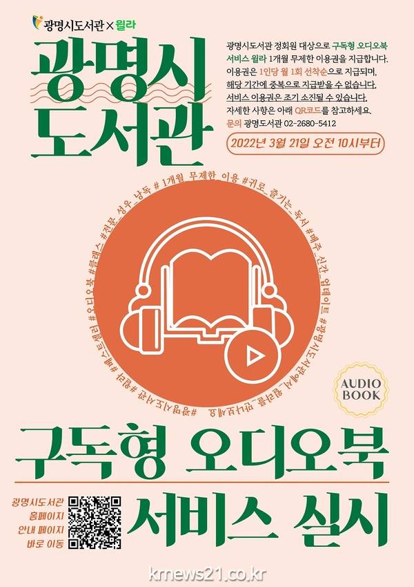 ▲ 사진=광명시광명시(시장 박승원) 광명도서관이 21일 10시부터 광명시 도서관 정회원을 대상으로 구독형 오디오북 서비스 ‘윌라’ 1개월 무제한 이용권을 지원한다.