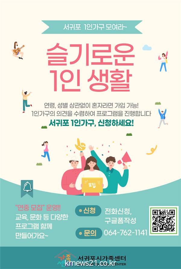 참여 대상은 서귀포시에 거주하는 1인 가구이면 연령과 성별에 상관없이 누구나 신청 가능하며, 3월을 시작으로 연중 모집운영할 계획이다.