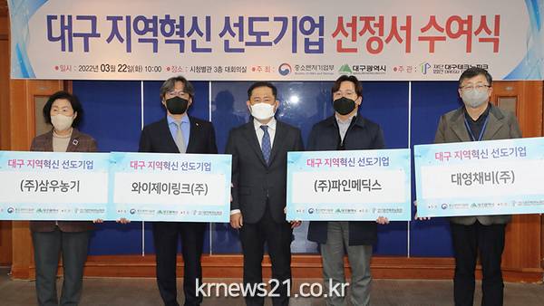 대구시와 대구테크노파크(이하 ‘대구TP’)는 22일(화) 오전 10시 시청별관 대회의실에서 정해용 경제부시장 및 선정기업 4개 사 대표가 참석한 가운데 ‘대구 지역혁신 선도기업 선정서 수여식’을 개최했다.
