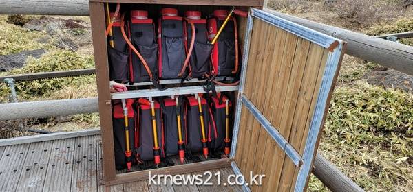 이 밖에도 어리목 외 3개 지구 관리사무실, 탐방로 등에 등짐펌프, 개인진화장비세트 등 산불진화장비 12종 847점을 배치하고, 탐방로 및 공원구역 주요지점에 산불조심 홍보물을 게시해 산불 예방활동에 힘쓰고 있다.