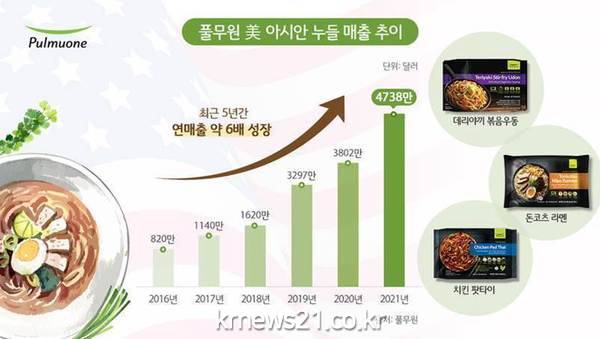 풀무원은 2015년 미국 아시안 누들 시장에 본격 진출했다. 당시 저가형 건면이 주류였던 미국 아시안 누들 시장에서 풀무원은 미국인들이 아시안 레스토랑에서 즐길 수 있는 맛을 제대로 구현한 프리미엄 냉장 생면 제품을 출시하고 현지 시장을 개척했다. 풀무원의 아시안 누들 매출은 2016년 820만 달러를 기록한 후 5년간 연 평균 약 42% 증가하여 지난해 4,700만 달러를 돌파했다.