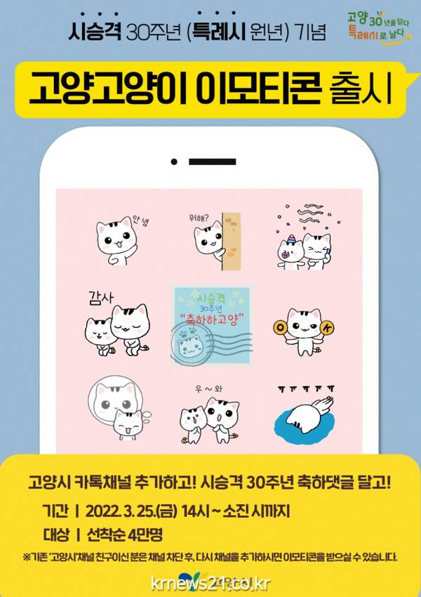 ▲ 사진=고양시고양시(시장 이재준)가 올해 고양 시승격 30주년과 고양특례시 출범 원년을 맞아 고양시 대표 캐릭터 ‘고양고양이’ 이모티콘 배포 이벤트를 진행한다.