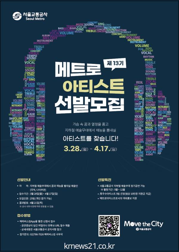 ▲ 사진=서울교통공사서울교통공사(이하 공사)가 3월 28일부터 4월 17일까지 제13기 메트로아티스트 25팀을 공개 모집한다. 코로나19 확산 방지를 위해 2020년부터 중단된 지하철 내 현장공연이 2년 만에 재개된다는 점에서 의의가 크다.