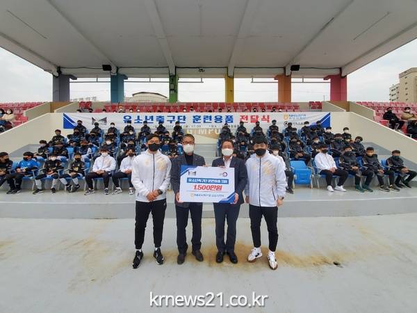 ▲ 사진=김포시김포시체육회(회장 임청수)는 지난 25일 김포종합운동장에서 유소년축구단 훈련용품 전달식을 진행했다.
