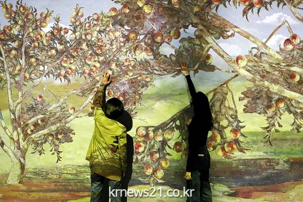 그중 ‘사과나무’(이인성 作, 1942년)는 벽면 터치 반응형 기술로, ‘화훼궤석’(서병오 作, 1927년)은 먹의 번짐을 이용한 변환 방식으로, ‘은행이 있는 거리’(서동진 作, 1930년대)는 입체적인 몰입형 방식으로 제작되어 원작의 특정 요소들을 더욱 감각적으로 경험할 수 있도록 하였다.
