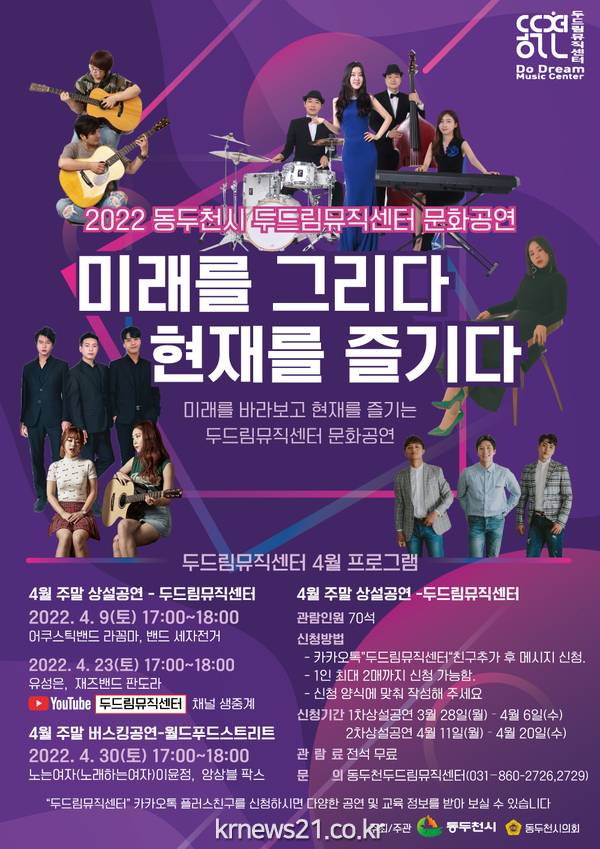 4월 공연은 전 세대를 아우르는 음악공연을 준비하여 관객들에게 잔잔한 감동과 재미를 줄 전망이다. 공연은 오후 5시부터 6시까지 1시간 동안 진행되며, 선착순 70명에 한하여 무료입장으로, 동반자 포함 2인까지 신청할 수 있다. 신청 방법은 신청기간 내 카카오톡 채널 ‘두드림뮤직센터’를 검색하여 채널 추가한 뒤 공연관람 신청양식을 참고하여 1:1 채팅으로 보내면 된다.
