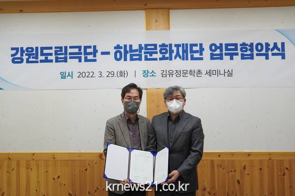 3월 29일 (재)하남문화재단(이하 ‘재단’)은 (재)강원도립극단(이하 ‘극단’)과의 업무 협약을 체결하고, 다가오는 6월 25일 뮤지컬 <</span>유정, 봄을 그리다> 공연 추진을 확정하였다.