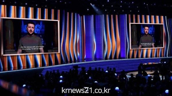 ▲ [SHUUD.mn=뉴스21 통신. 무단 전재-재배포 금지.]볼로디미르 젤렌스키 우크라이나 대통령이 '제64회 그래미 어워즈' 시상식에 영상으로 등장해 러시아 침공으로 위기에 처한 자국에 지지를 보내달라고 호소했다.