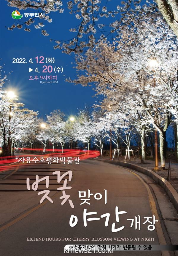 ▲ 사진=동두천시동두천시 자유수호평화박물관은 진입로와 야외전시장 주변에 심어진 벚꽃 개화기를 맞아 4월 12일(화)부터 20일(수)까지 9일간 개관시간을 오후 9시까지 연장 개방한다고 밝혔다.