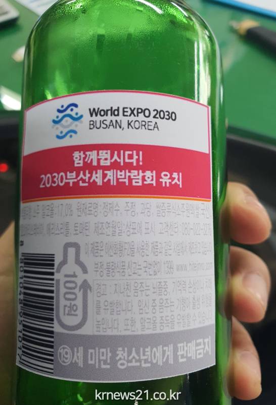 부산시는 하이트진로 대표 주류제품인 ‘참이슬’에 2030부산세계박람회 유치를 기원하는 홍보 문안을 넣어, 오는 5월부터 1천만 병을 출시한다고 밝혔다.