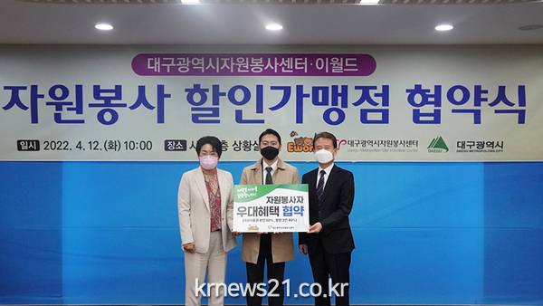이월드(대표 방병순, 이수원)는 4월 12일(화) 오전 10시, 시청 2층 상황실에서 대구시자원봉사센터와 함께 상호 신뢰와 협력을 바탕으로 건강한 자원봉사문화 형성 및 확산에 기여하고자 자원봉사자증 소지자에게 이월드 자유이용권 할인혜택을 제공하는 협약을 체결하고 자유이용권 1천장을 기부했다.