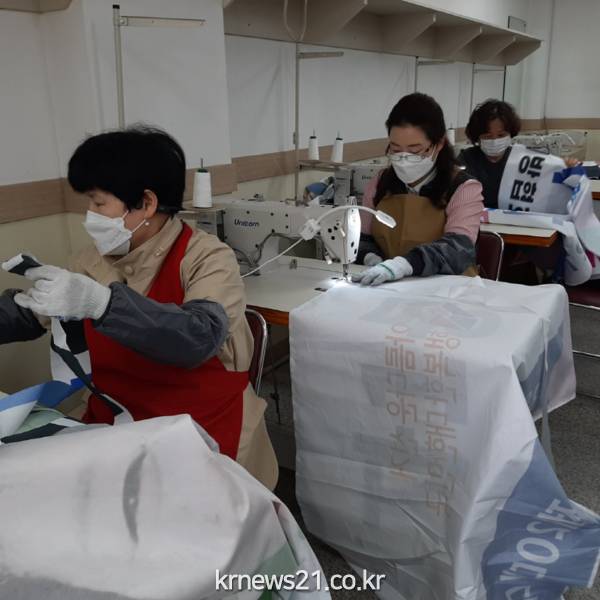 이후 수원시는 수원도시공사에 폐현수막 440매를 지원했고, 수원도시공사는 수원시여성단체협의회 회원·자원봉사자 등 시민 70여 명과 함께 수원시가족여성회관 의상실에서 폐현수막을 활용해 재봉틀로 자루를 만들었다.