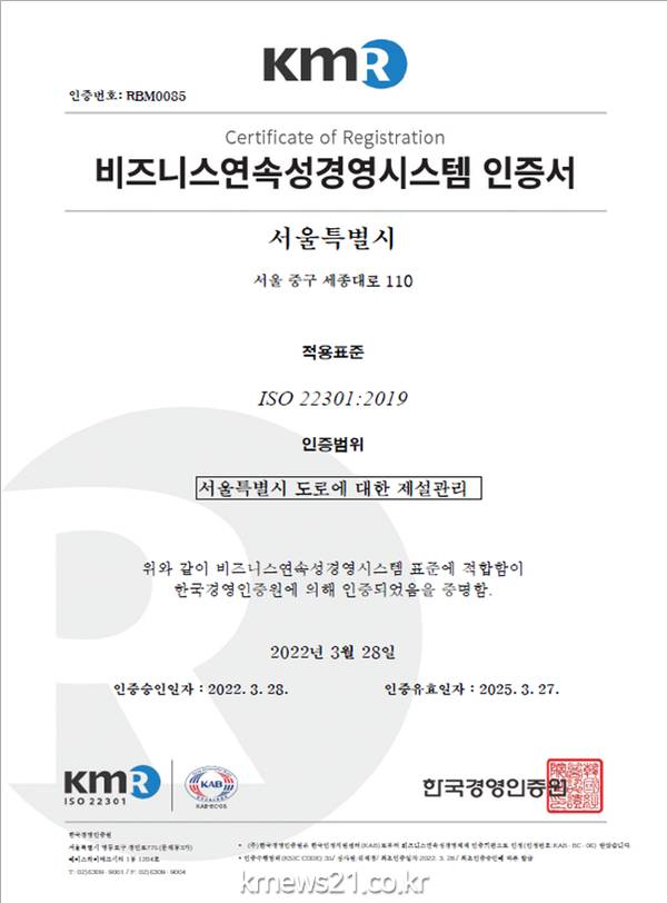 시는 지난해부터 비즈니스연속성 경영 계획을 수립해 겨울철 비상대비 단계별 훈련 및 표준매뉴얼을 작성하는 등 ISO 22301 국제인증 획득을 위한 표준문서체계를 마련하고, 지난 3월 현장 심사를 거쳐 한국경영인증원으로부터 인증이 최종 확정됐다.